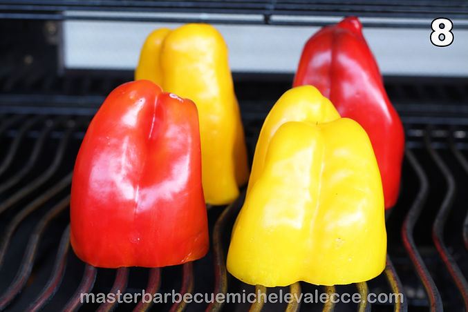 Preriscaldate il barbecue per una cottura indiretta a 180° C. Si possono fare anche nel forno di casa con impostazione statica a una temperatura di 160° C. Posizionate i vostri peperoni a testa in giù come si vede dalla foto 8 e cucinateli per circa 15-20 minuti. Questa operazione di pre cottura serve per non farli rimanere crudi quando avrete terminato la preparazione della ricetta.